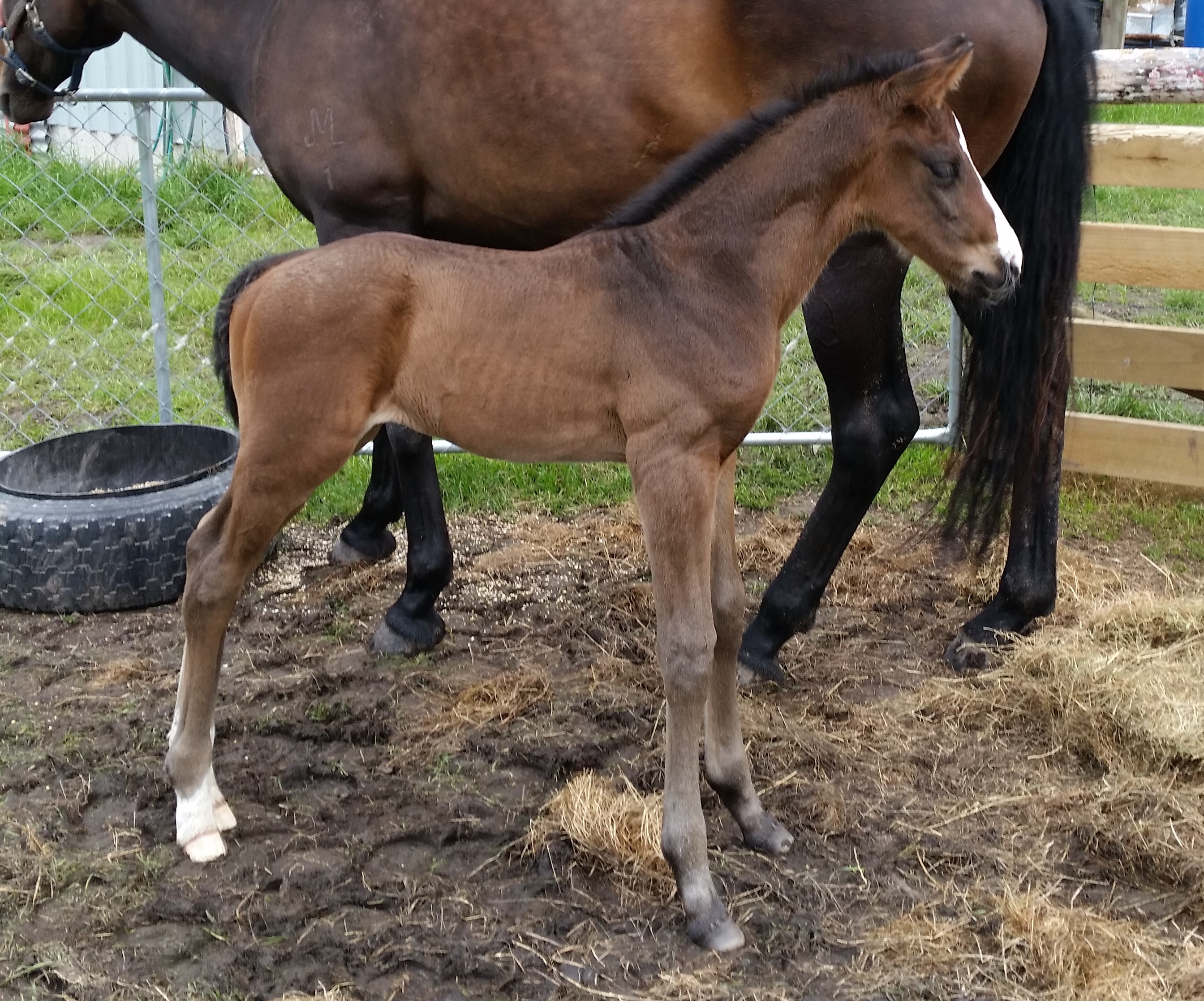 Upstanding, correct bay colt from my super Hanoverian elite candidate mare Smitten. Sire is Kirsty Schists Epiton MD, who was imported from Germany as a weanling. Sadly he only stood to a limited number of mares before being gelded to pursue his riding career.