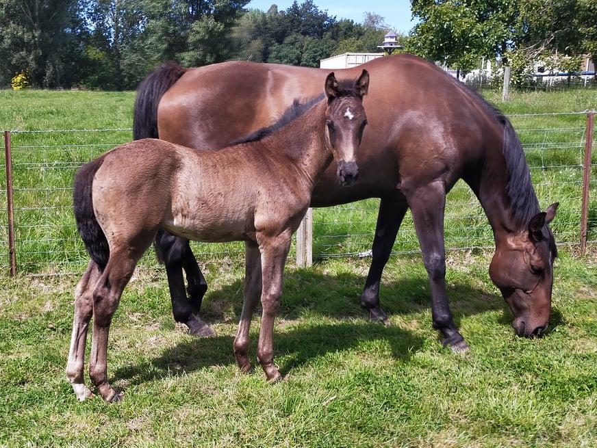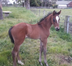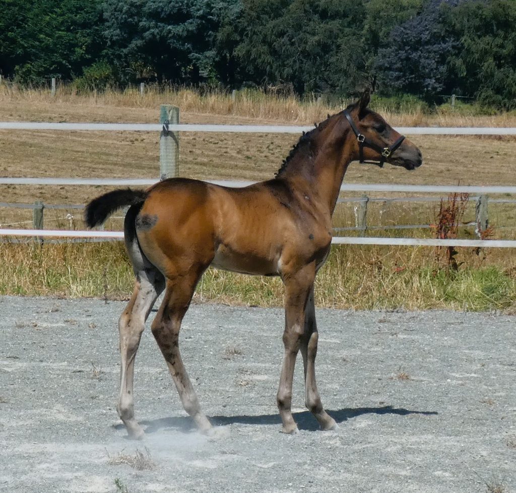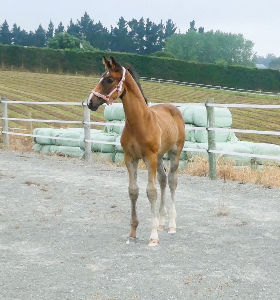 Stunning, big bright bay colt, born an agonising three weeks late. This boy is very striking and full of personality and charm. He is very friendly and adores people and attention. Lovely movement with lots of power. He is growing into a big handsome boy and looks like he will easily exceed 16.2hh easily. He attended NZWBA inspection as a tall, gangly four month old, where he scored an impressive 80% for movement.