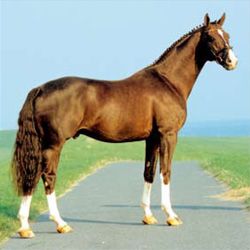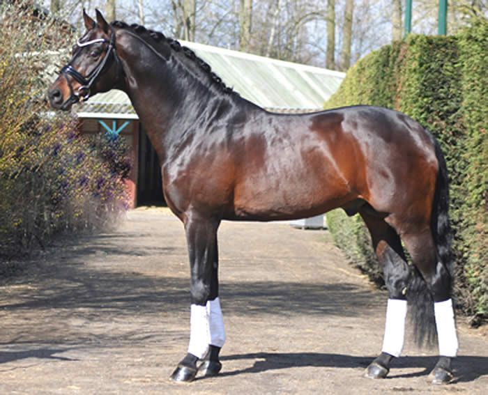 His sire Sandreo is a licensed hanoverian and KWPN stallion. Son of the sought after, Sandro Hit, this superb bay/brown stallion is remarkable for his refinement, his lightness, and the perfect conformation of his gaits. He has been a very successful and prolific stallion with numerous offspring competing to Grand Prix level.