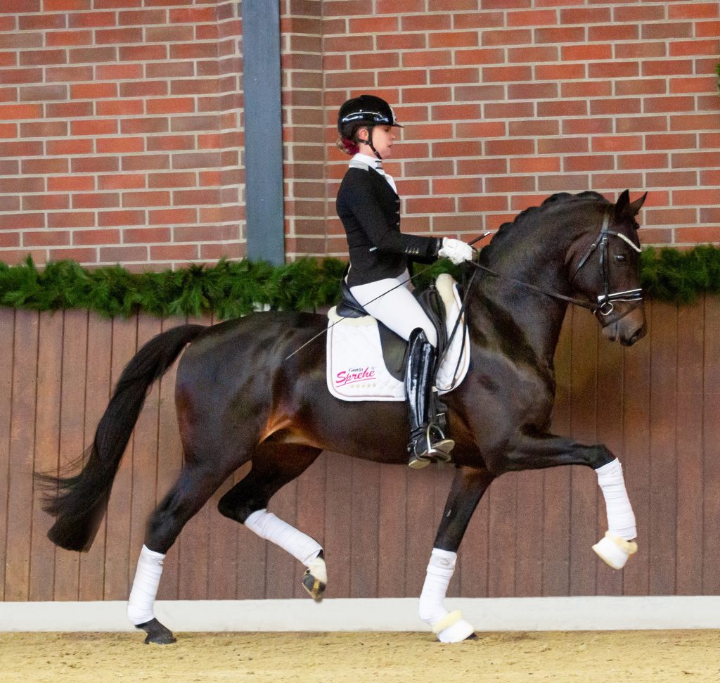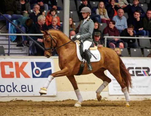 Her sire Galaxy is the prototype of a modern dressage horse. With a lot of nobility and elegance, he knows how to move like a feather. Despite all his light-footedness, his gait potential in trot and gallop is based on a very stable, load-bearing hind leg. The walk is always in rhythm and shines with its scope and diligence; Galaxy’s willingness to perform is exemplary. After successfully passing his 50-day stallion test in Schlieckau in 2019, he shone in 2020 with gala performances under the saddle of Simone Pearce. After a first-class first crop of foals with the Münster top price “Ganz große Kino” (dam’s sire Samarant / hammer price 30,000 E), Galaxy was named 1c main premium winner in Vechta.