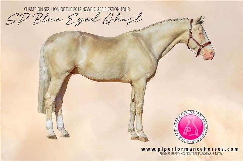Sire SP Blue Eyed Ghost is an American bred Cremello Warmblood that was imported to NZ as a 3 year old. He is approved for the New Zealand Warmblood Studbook and in 2012 he was the Champion Stallion of the Warmblood Classification Tour. Initially trained in dressage he was successfully competed to Level 4 before making the switch to show jumping. SP Blue Eyed Ghost moved quickly through the heights in his first two seasons till he was successfully competing at Grand Prix. Ghost is a very beautiful, elegant stallion with an exceptional temperament and fantastic rideability.